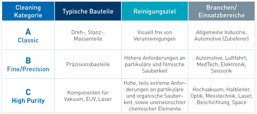 Im Bereich der klassischen Reinigung, der so genannten Kategorie „A“, sind es überwiegend Bauteile, die in der allgemeinen Industrie, bei Automobilzulieferern und weiteren Branchen in größeren Stückzahlen hergestellt werden und bei denen keine strengen Anforderungen an die Sauberkeit zu erfüllen sind, beispielsweise oberflächlich „partikel- und fettfrei“. Die Sauberkeitskontrolle erfolgt dabei visuell und mit herkömmlichen Messverfahren.